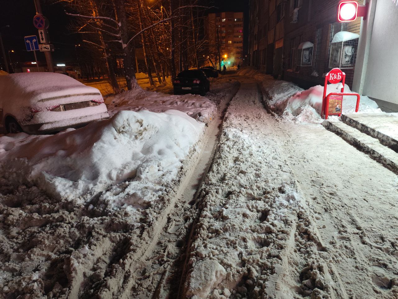 Подьездная дорога к коммерческим помещениям вдоль жилого дома на проспекте Победы д. 150 со стороны парка 40 лет Победы утопает в снегу. Уже образуются глубокие колеи, и как только подморозит - проехать станет максимально сложно. В прошлом году ситуация была аналогичная. Обслуживает дом ЖСК Черемушки.
