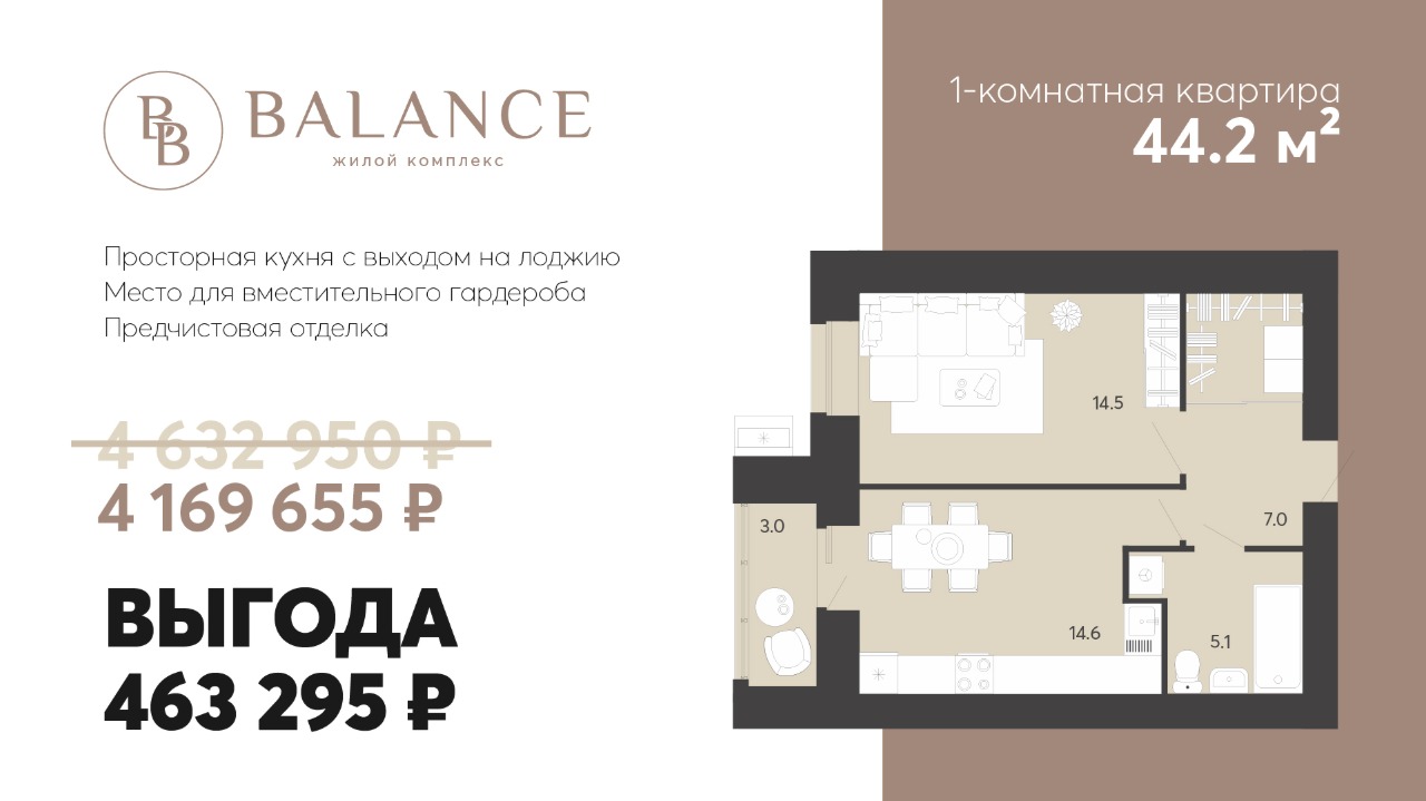 - Просторная планировка — 44 квадратных метра комфортного пространства.