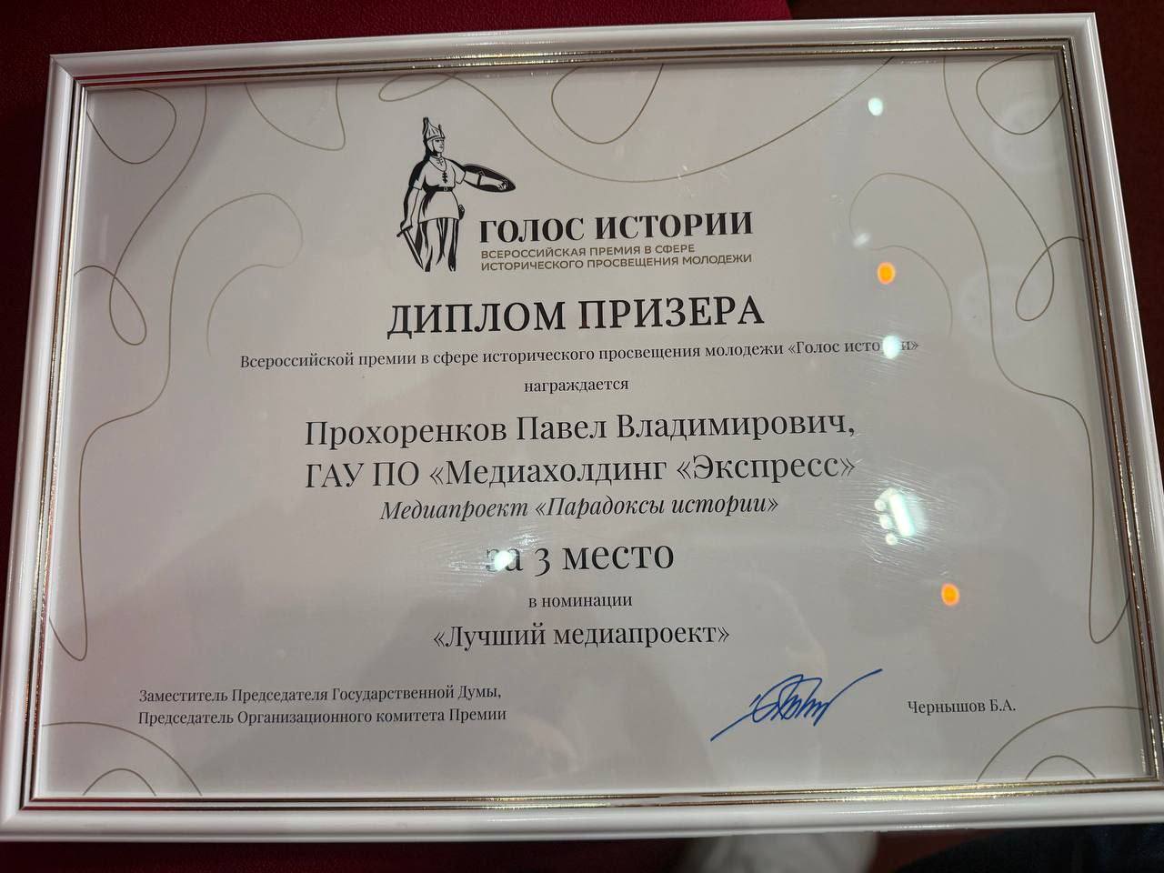 Губернатор Пензенской области Олег Мельниченко в личном Telegram-канале поздравил исполнительного продюсера медиахолдинга «Экспресс» Павла Прохоренкова с третьим местом по итогам всероссийской премии в сфере исторического просвещения молодежи «Голос истории».