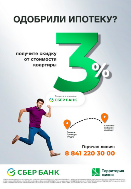 ГК «Территория жизни» объявляет о старте нового проекта для клиентов ПАО «Сбербанк» - скидка 3% от застройщика на покупку жилья в ипотеку.