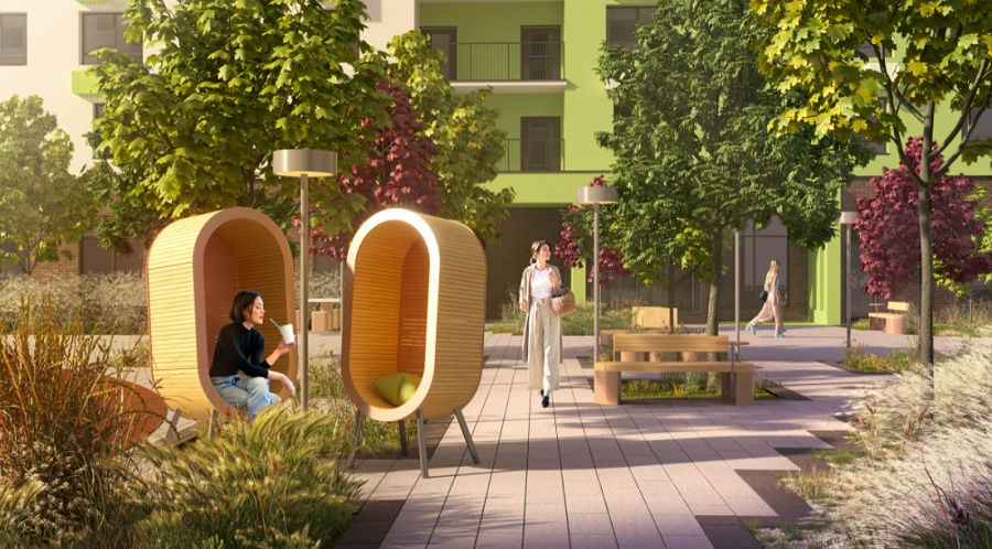 Внутри детских игровых пространств предусмотрено оборудование для детей с особенностями. Тихие зеленые дворы комфортны и безопасны, в них нет машин, поэтому жители могут чувствовать себя уютно. Реализована концепция «двор-сад», в отделке фасадов домов и подъездов используется «цветочная» тема.