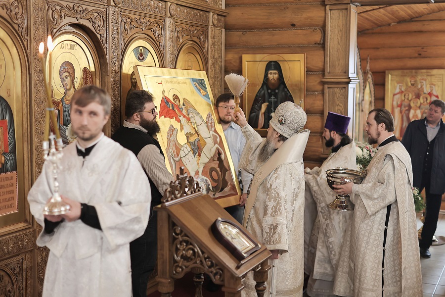 Затем уже в жилом комплексе «Арбековская застава» владыка Серафим провел праздничную литургию в храме Адриана и Наталии. Храм в этот день отмечает свое десятилетие. После службы митрополит Серафим сердечно поблагодарил руководителей группы компаний «Территория жизни», которые помогали возведению и благоустройству храма.