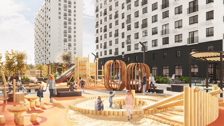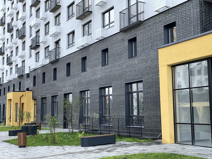 В просторных подъездах домов, выполненных в едином стиле, просторные холлы, бесшумные лифты и комнаты для мойки лап. Дворы без машин, имеют выход к пешеходному бульвару. Внутри – детские площадки, обустроенные игровым и спортивным оборудованием. Семья может выбрать для себя квартиру как на этапе строительства, как и в уже сданном доме.