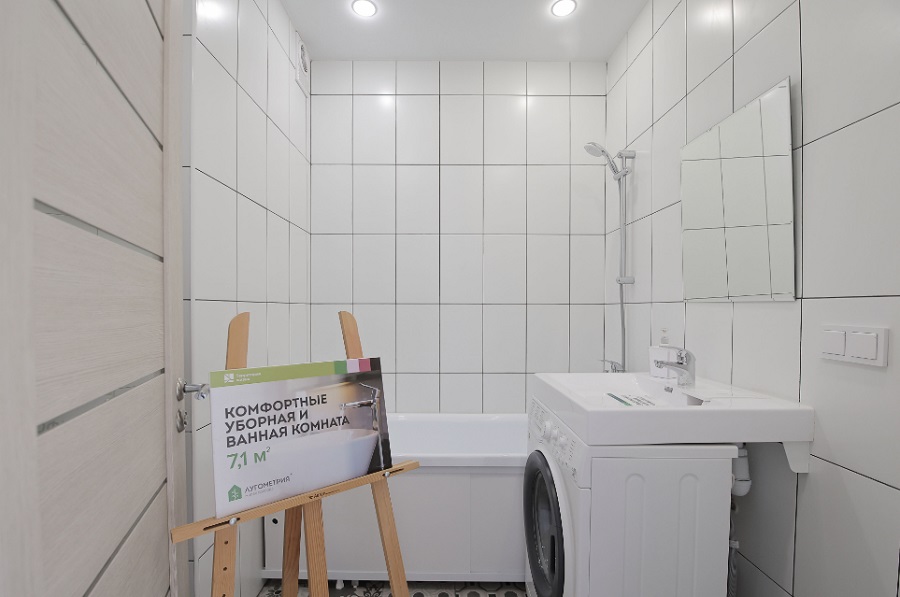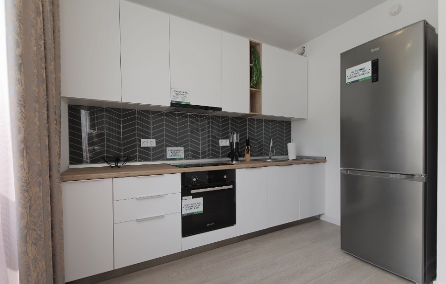 ** Отделка «Все включено» включает в себя флизелиновые обои под покраску, ламинат светлых тонов, межкомнатные двери, натяжные потолки, сантехнику и санфаянс, кухонный гарнитур, варочную панель и духовой шкаф, стиральную машину.