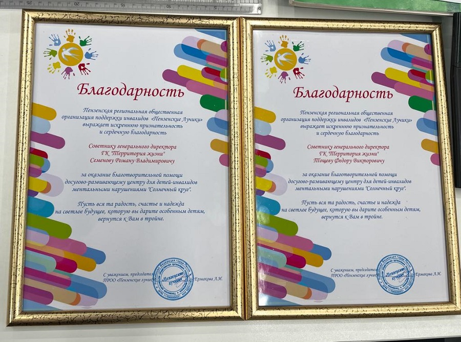 Председатель Пензенской региональной общественной организации поддержки инвалидов «Пензенские лучики», один из членов совета Людмила Ермакова вручила грамоты с благодарностью руководству компании ГК «Территория жизни» за помощь и поддержку в рамках совместного проекта с региональным отделением Сбер.