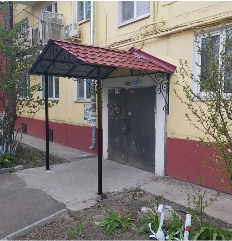Город Пенза, ул. Коммунистическая, дом 25 плохой навес возле подъезда. Бетонные плиты отошли от стен. Их в том году зафиксировали трубами. Конструкция из труб не надежная, это временно можно сделать. Желательно сделать навес современный, 2 лавочки стоят возле подъезда красивые, урны нет рядом. Дом красивый, фасад отремонтированный немного, спасибо.