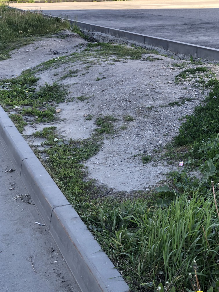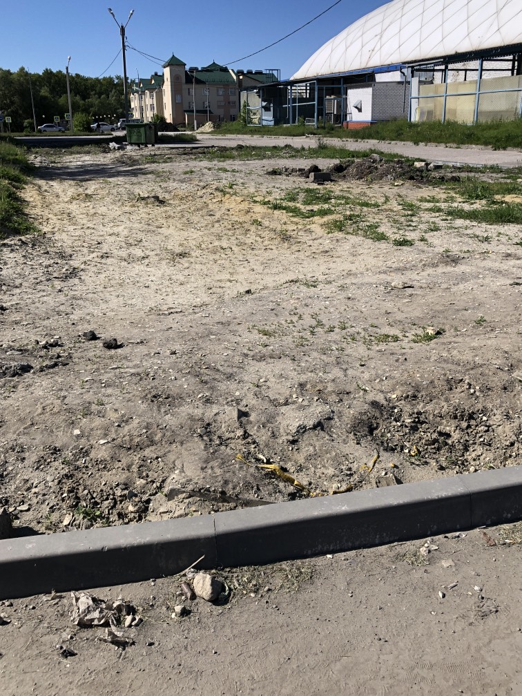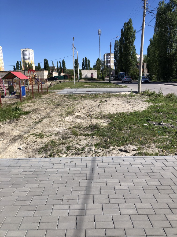 Здравствуйте! С прошлого года здесь были работы по прокладке труб. Работы окончены, а вот благоустройство не восстановлено! На местах разрытий должен быть рассыпан чернозем и засеян газон. Здесь была трава и благоустроенная территория! Сейчас этого нет! Фото жителей приложено. Посмотрите пожалуйста.