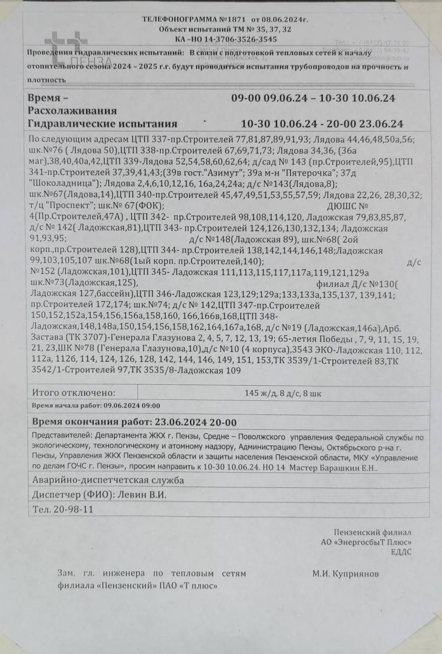 На ул. Ладожской, 164 спустя две недели отсутствия горячей воды ее подачу так и не восстановили. Хотя было обозначено время окончания работ – 20:00 23 июня (прилагаю телефонограмму №1871 от 08.06.2024, которая была опубликована в чате Октябрьского района).