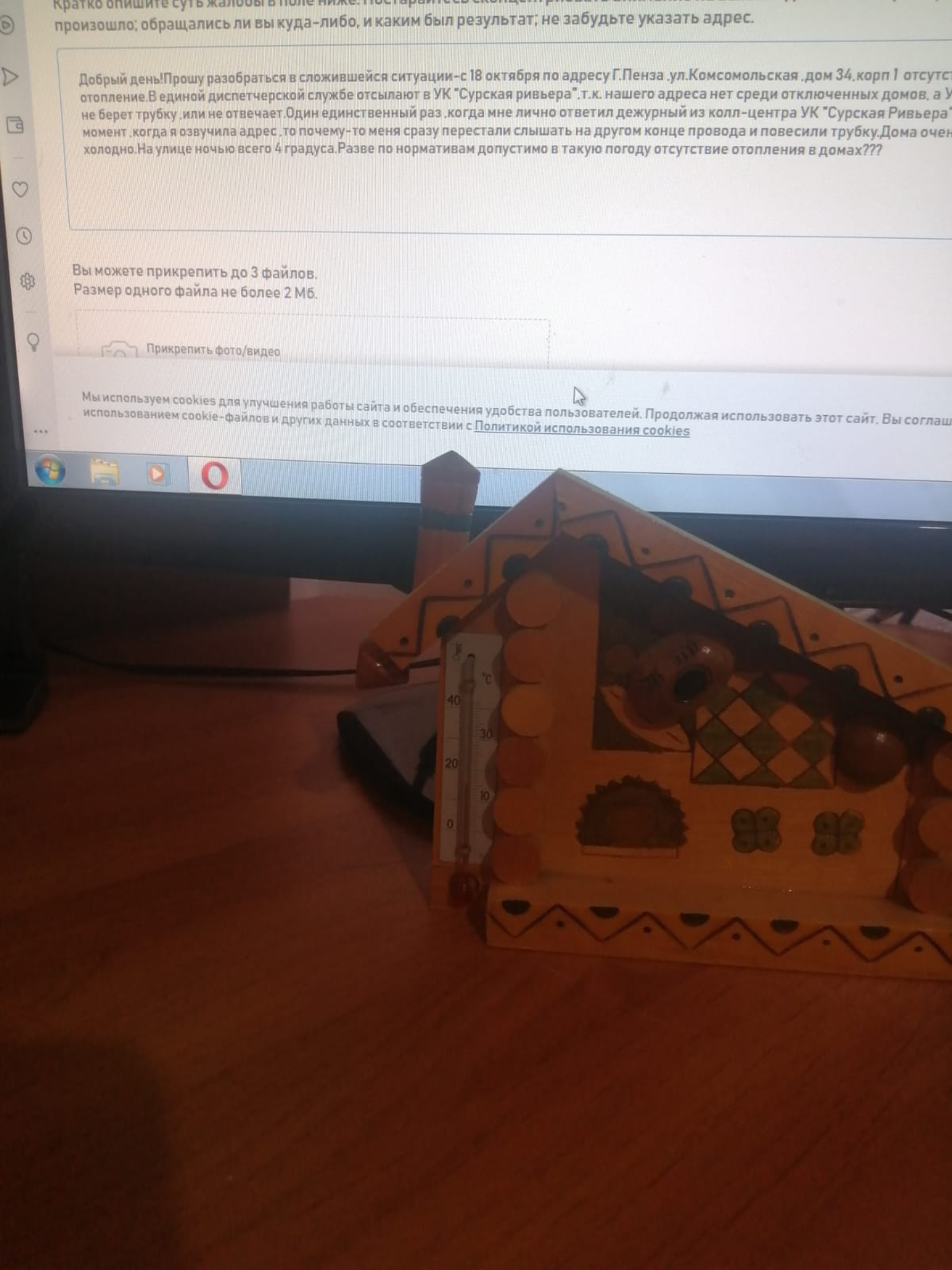 Добрый день! Прошу разобраться в сложившейся ситуации - с 18 октября по адресу Г.Пенза ,ул.Комсомольская ,дом 34,корп 1 отсутствует отопление.В единой диспетчерской службе отсылают в УК "Сурская ривьера",т.к. нашего адреса нет среди отключенных домов, а УК или не берет трубку, или не отвечает. Один единственный раз, когда мне лично ответил дежурный из колл-центра УК "Сурская Ривьера" в тот момент , когда я озвучила адрес,то почему-то меня сразу перестали слышать на другом конце провода и повесили трубку. Дома очень холодно. На улице ночью всего 4 градуса. Разве по нормативам допустимо в такую погоду отсутствие отопления в домах? С уважением-Леонтьева С.В.