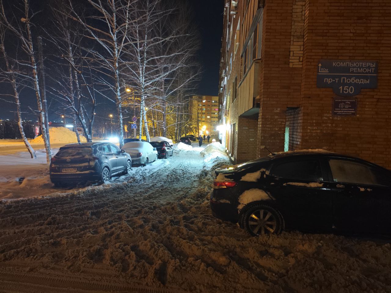 Подьездная дорога к коммерческим помещениям вдоль жилого дома на проспекте Победы д. 150 со стороны парка 40 лет Победы утопает в снегу. Уже образуются глубокие колеи, и как только подморозит - проехать станет максимально сложно. В прошлом году ситуация была аналогичная. Обслуживает дом ЖСК Черемушки.