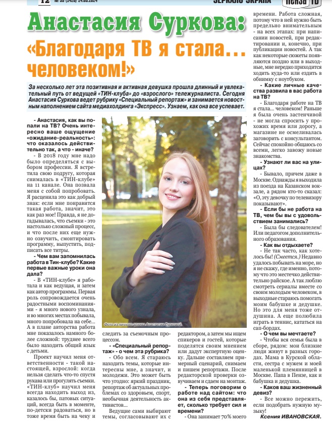 Ведущая рубрики «Специальный репортаж» и работник сайта медиахолдинга «Экспресс» Анастасия Суркова рассказала в интервью «Пенза плюс ТВ» о длинном и увлекательном пути в профессию.
