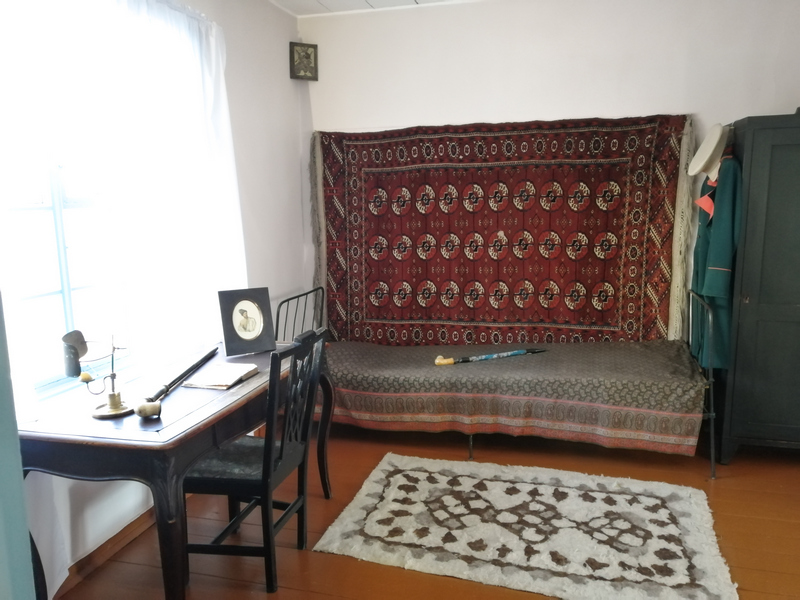 В этой комнате поселился Столыпин, дядя поэта. У стены находится длинная армейская кровать, покрытая персидской тканью ручной работы. На ней лежат длинные курительные трубки того времени – чубуки. На шкафу висит образец формы поручика Тенгинского пехотного полка. В такой же форме служил на фронте и погиб на дуэли поэт.
