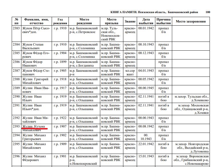 Кузьма Михайлович Жулин ушел на фронт в 1941 году, когда ему было 29 лет. В его семье на тот момент воспитывались пятеро детей: 10-летний Вася, 8-летняя Нюра, 6-летняя Катя, 4-летняя Таня и трехмесячный Ваня.