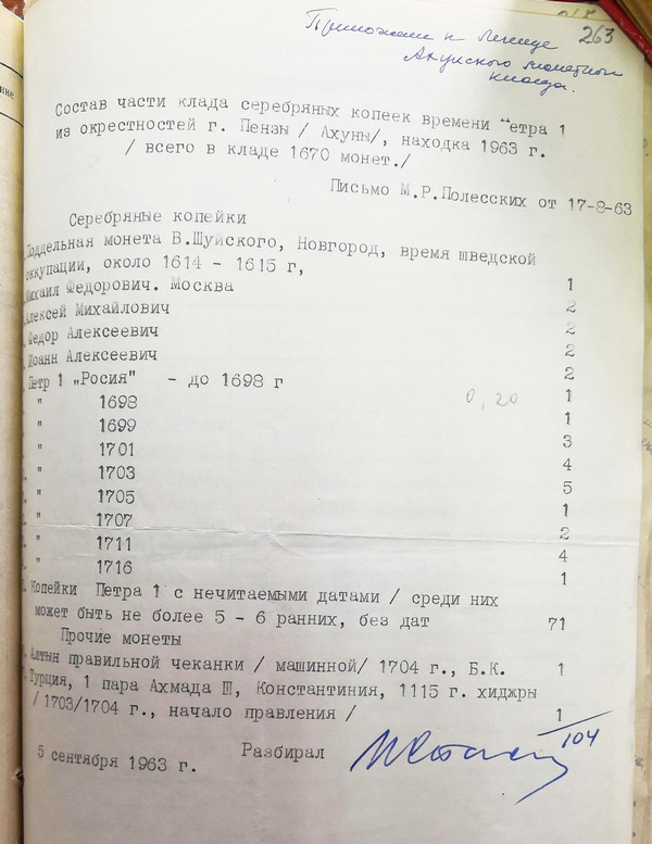 Краевед сообщил: в описи указано, что в кладе, который нашли на огороде в Ахунах, обнаружено более 1600 серебряных монет, научно определено 104 из них. Они были созданы в период от времени царствования Василия Шуйского до Петра I, самая поздняя датирована 1716 годом. Примечательно, что экспертизу проводил известный советский нумизмат, сотрудник «Эрмитажа» Иван Георгиевич Спасский.
