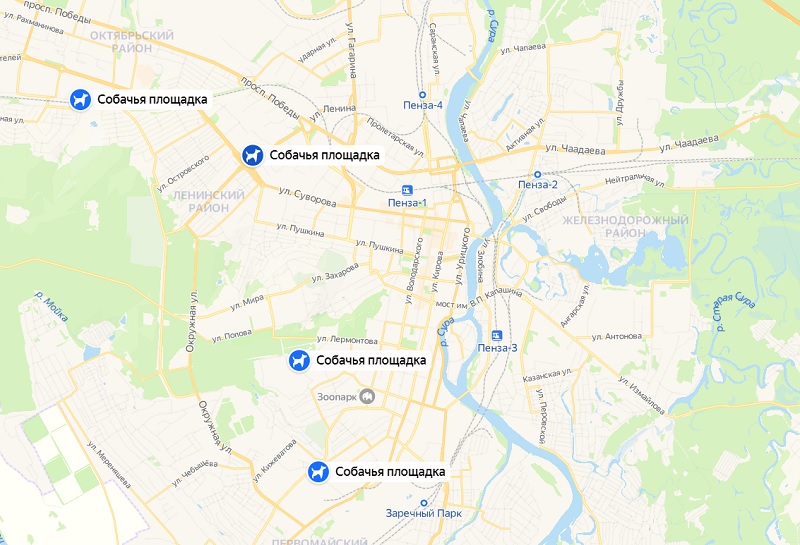Пусть рекреаций для собачников в Пензе немного, но все-таки они есть, их даже отмечают на картах - в Арбеково, на ул. Карпинского, на Окружной и в Военном городке. Конечно, такого количества недостаточно, но власти планируют в ближайшее время создать еще четыре площадки – по одной в каждом районе.