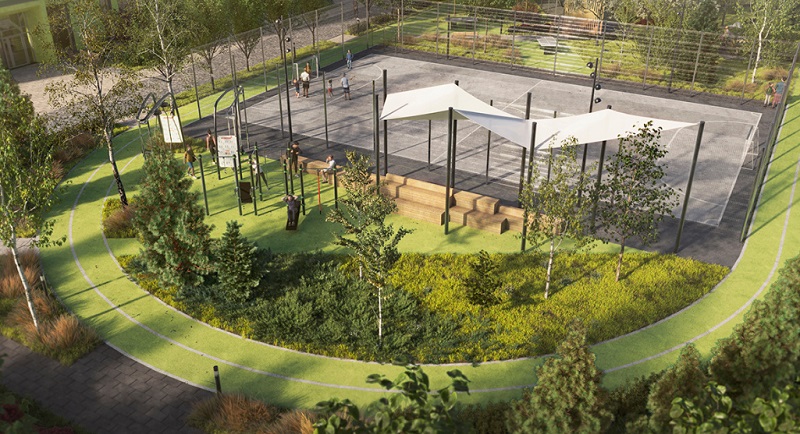 За домами - play-пространство для спорта и активности, где можно шуметь и веселиться, не мешая соседям. В этой зоне появятся спортплощадка с навесом-парусом и трибунами, зона workout, высокая горка-башня и яблоневый сад, а вокруг – беговая дорожка.