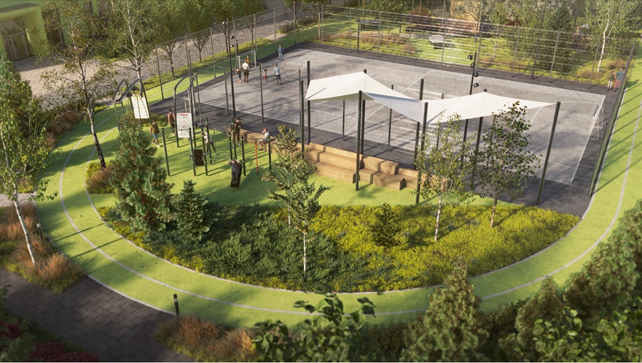 Внешняя зона станет динамичной. Любители активного отдыха порадуются play-пространству для спорта и активности. Рядом со спортивным полем – зона воркаут. Архитекторы отказались от традиционных тренажеров и установят больше разноплановых элементов - турники, канат, кольца и лестницы, подвесные колокола и прочие снаряды, дающие больший простор для занятий. Соседи будут спокойны – шум будет не слышен. Между ними расположится миниатюрный яблоневый сад, теннисный стол, гамаки и качели. Беговая дорожка с мягким покрытием опоясывает play-пространство.