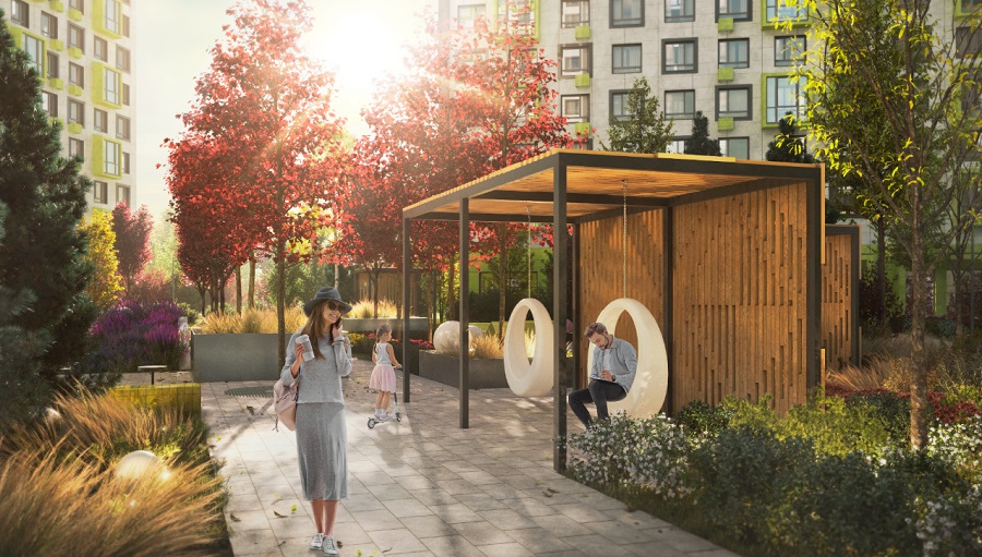 В «Зеландии» будет закрытый двор без машин. Пространство квартала разделяется на две части. Внутренняя - в квадрате между домов - отведена для тихого спокойного отдыха и малышей: для детей установят множество игровых элементов, для взрослых - места для расслабления и работы со светящимися круглыми LED-качелями - впервые в жилом комплексе «Рисана».