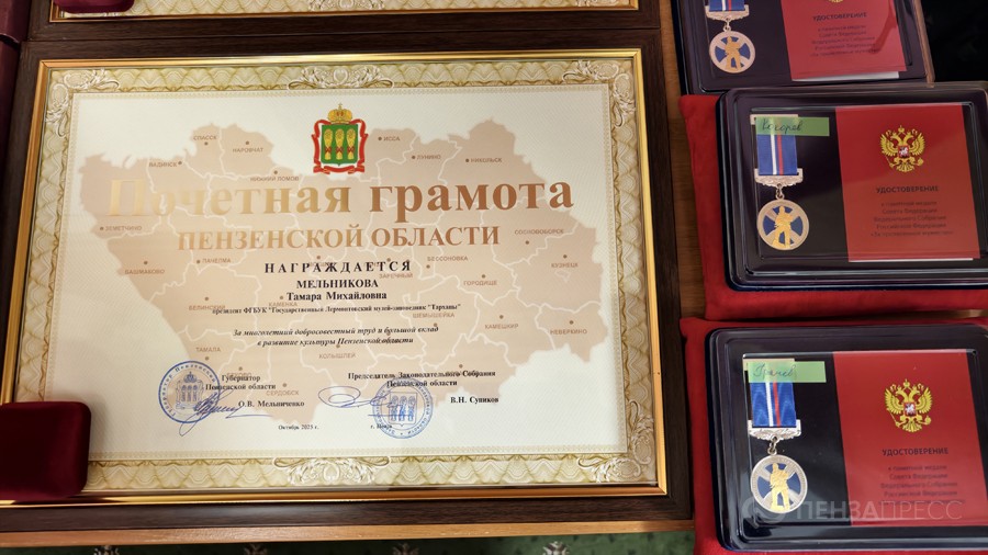 Всего в этот день награды получили 82 человека. Так, за большой вклад в социально-экономическое развитие региона почетными грамотами Пензенской области награждены Тамара Мельникова, президент Государственного Лермонтовского музея-заповедника «Тарханы», и Светлана Пинишина, почетный гражданин города Пензы.